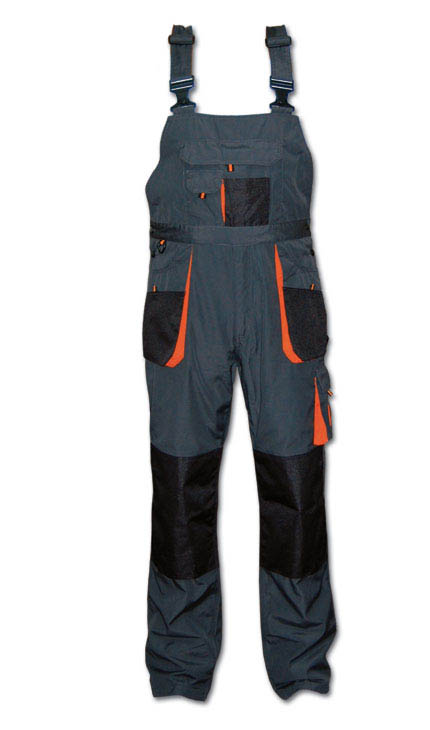 Radni polukombinezon modernog izgleda, tkanina visokog kvaliteta sa DuPont 600D ojačanjima na mestima izloženom većem habanju, diolen 280gr, PE 65%/35% pamuk, crne boje sa narandžastim detaljima.