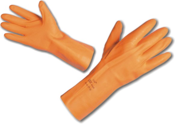 • Prirodni latex 100%, otporne na hemikalije srednje jačine, (soli, deterdžente, alkohole, alkale i masti) debljina 0.75 mm, dužina 32 cm, sa hlorom, reljefaste, flokirane sa cistim pamukom, upija znoj, narandžaste.